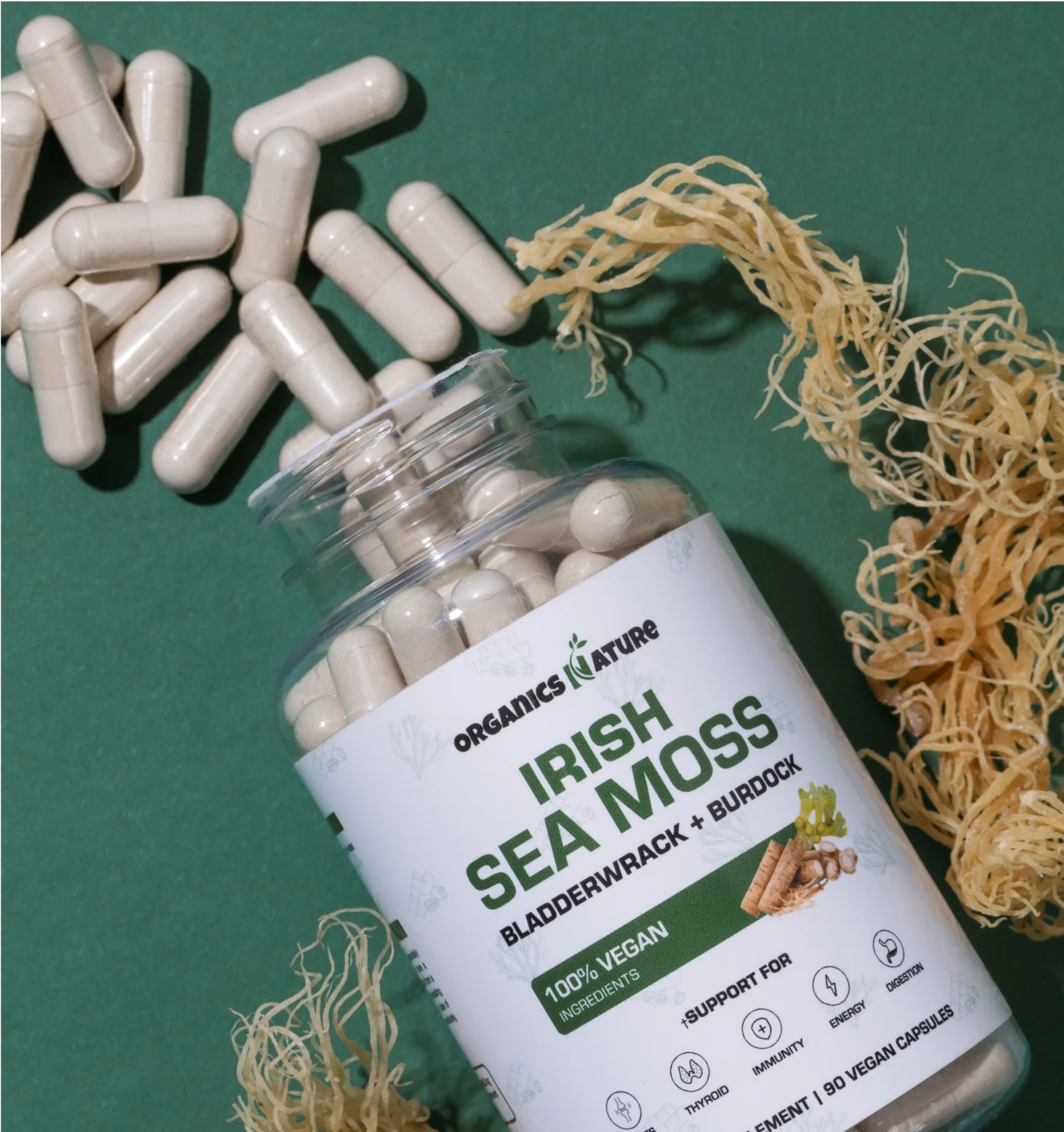 1000MG of Organic Irish Sea Moss, containing over 90 vitamins and minerals that improve gut health, heart & nerve function, support immune system, regulate blood pressure, support thyroid, and clears mucus.